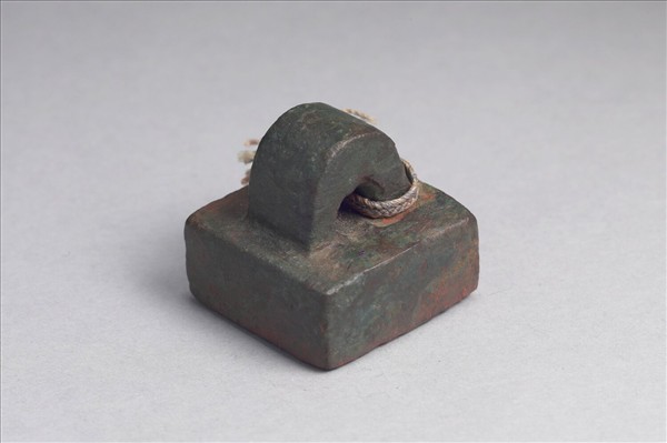 鼻鈕,方面銅印體中厚,印面白文「騎部曲督」四字,無邊,筆畫粗,篆法不甚工整,鈕為易於繫繩之用。