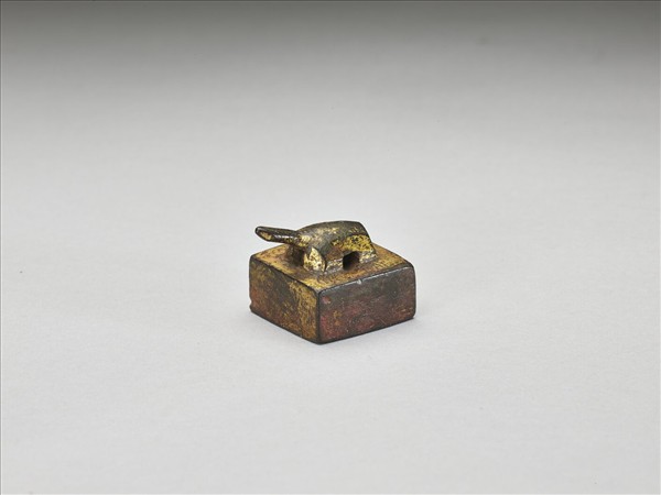 鎏金銅印,龜鈕。龜鈕身小形簡,頭頸細長、印身厚高。印面白文五字「輔國將軍章」,筆畫尖削,雖為刀鑿,而線條挺拔,方中帶圓,章法自然。