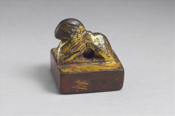 鎏金,駝鈕,印體一角受斵,可能示人歿印毀之意,印面「晉歸義氐王」白文五字,無邊。氐族自魏時歸順,晉時楊千萬之裔楊茂搜自立為氐王,氐族漸強,在五胡十六國中佔重要地位。外族王者之印皆鎏金,以顯尊貴。