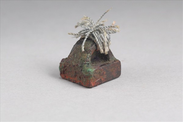 橋鈕繫繩,方面銅印,印面為篆體印文「趙護工印」四字,做白文雙行,以逆時針方向排列,大小不一。