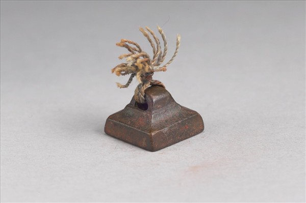 壇鈕繫繩,方面銅印,印面為篆體印文「趙盧稽」三字,做白文雙行,筆畫細長,字體工整。