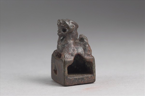 此辟邪鈕之頭正視,印體中空可容子印,惜已遺失,印面「趙仲」白文二字,有邊。