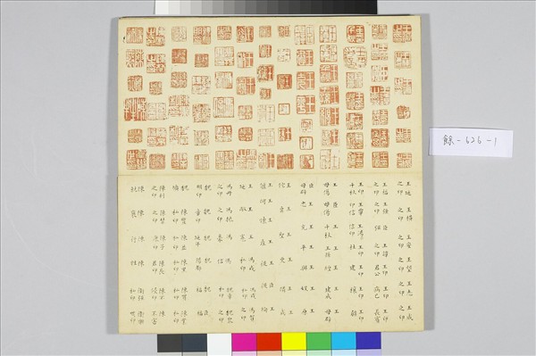 院藏有五件樣式類同的黑地金漆龍紋屜匣,內皆置木殼面小冊頁一本,以及為數眾多的銅章。由於屜匣的蓋面都有金漆「金薤留珍」楷字,且其題銘後各自附有一小字,分別為「東」、「壁」、「圖」、「書」、「府」,可知這是五組成套的印章收藏。其中的木殼面小冊頁,即為該屜匣所收銅章的目錄,而本件小冊頁即為置於「圖」屜匣者。小冊頁作梵夾式,七開,木質封面有「金薤留珍 圖」填綠隸款。內頁除清高宗行書題銘「金薤留珍」四字外,還書有為該屜匣所收銅章品目項類,以及銅章鈐跡、印文釋文,其鈐跡與釋文上下相對,使人一望可知該屜匣所收銅印的概況。「圖」字匣主要收藏私印,計三百四十二方。若是進一步取閱「東」字號小冊頁的乾隆十六年(1751)清高宗所作〈古銅章歌〉,以及「府」字號小冊頁中的大臣跋語並讀,便可瞭解這一套收藏的緣起,實因於乾隆皇帝命令臣下整理編次內府所收的前代印章。古代銅玉印之為收藏的品項,大致可追溯至宋代的《宣和印譜》,但因無實物可徵,故真實性仍有待商榷。至明代,顧從德為羅王常(製墨家羅小華之子)家藏古印刊行的《集古印譜》問世以後,才真正讓古代印記成為收藏的重要品項。影響所及,除了篆刻家多以《集古印譜》所刊為臨模範式外,人們也會想要收藏《集古印譜》中所刊的印章實物,院藏乾隆皇帝下旨編次的〈虹文薈古〉套印,就是這種影響下的產物。進一步細察「金薤留珍」諸字號小冊頁中目錄編次,其以官印為始,私印為次,並從中分別官職、姓氏,實是上追了《集古印譜》編次分類的方式。如此一來,我們更可以瞭解這一套收藏活動的性質,不只是整理內府收藏,而且還援引了明代以來的銅玉古印收藏傳統。