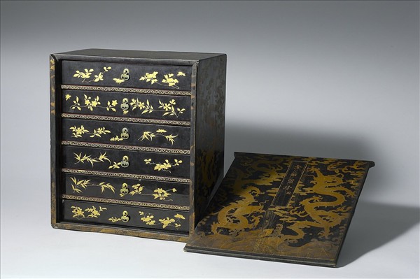 金薤留珍「圖」櫃屜匣,匣為拖拉式蓋,匣內有六屜,每屜中央皆裝有蝠紋金屬拉環。全器髹黑漆,匣外飾描金雲龍紋,正面(蓋)及背面有昇龍與降龍組成的對龍,正面中央題「金薤留珍/圖」,背面中央有一火珠,兩側各飾一降龍,龍首皆朝向匣盒之前方,四面下緣皆飾壽山福海,匣頂飾正龍一;屜面有描金桂、菊、佛手、罌粟、剪秋羅等折枝花卉,以及竹與蜂、蝶紋,隔板飾卷葉紋。各屜皆有編號,如本櫃為「圖」櫃,由上至下分別為圖一~圖六,除圖一屜內為該櫃之印譜外,三百四十二方私印存放於以下各屜中。「金薤留珍」乃乾隆朝時將內府所收的前代印記整理編次而成;包含銅官印221件,私印1070件,共1291件,存放於「東」、「壁」、「圖」、「書」、「府」五個黑地金漆龍紋屜匣中,並依各櫃所藏編製印譜。印譜目錄編次方式以官印為始,繼以私印。