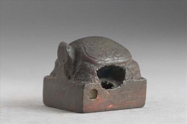 龜鈕,穿孔呈不規則狀,印身有漏銅造成的小窩坑,為鑄造缺陷。印面「任賀」白文二字,無邊。