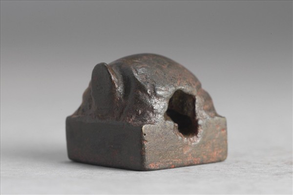 龜鈕,龜首昂起,龜背與四足圍成空隙。印面正方,右起橫讀篆文「任賀」二字,白文,「賀」字上半部轉平正為曲折,都增添了印面表現的變化。為私印。