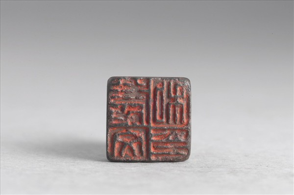 銅印,瓦鈕,鈕上繫繩,印面正方,右上起順讀篆文「慶文私印」四字,「慶」、「印」二字作白文,餘二字為朱文。私印。本印置於清乾隆朝「金薤留珍」之「書」櫃屜匣中。「金薤留珍」乃乾隆朝時將內府所收的前代印記整理編次而成。其包含銅官印221件,私印1070件,共1294件,存放於「東」、「壁」、「圖」、「書」、「府」五個黑地金漆龍紋屜匣中,並依各櫃所藏編製印譜。印譜目錄編次方式以官印為始,繼以私印,可能是援引明代以來印譜編目的傳統。