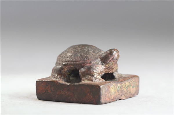 龜鈕,印體中凹而薄,印面「孟饒」白文二字,無邊,筆畫壯碩。