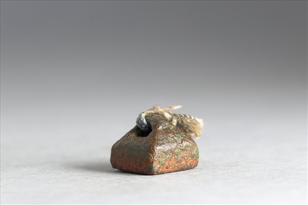 鼻鈕,方面印體中厚,銅中帶紅,鈕上有繫繩,印文「睪蒼」二字白文方框。本印置於清乾隆朝「金薤留珍」黑地金漆龍紋屜匣之五篋其中「府」屜之中。