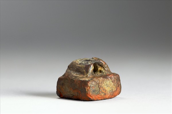 瓦鈕,方面印體中厚,銅中帶紅,然印體及印面皆斑駁,侵蝕深刻。印文「奚□放印」四字白文無邊。本印置於清乾隆朝「金薤留珍」黑地金漆龍紋屜匣之五篋其中「府」屜之中。