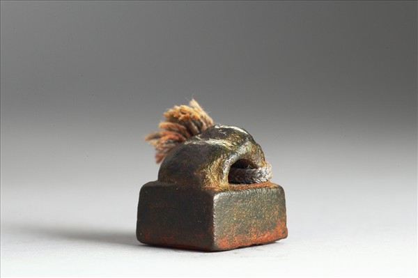 瓦鈕,方面印體中厚,銅中帶紅,鈕上有繫繩,印文「呂竟私印」四字白文方框,篆法雄渾古樸。本印置於清乾隆朝「金薤留珍」黑地金漆龍紋屜匣之五篋其中「府」屜之中。