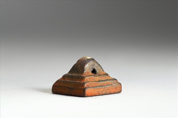 壇鈕,方面印體呈三層階梯的壇狀,中厚,銅中帶紅,印文「鄭□」二字白文無邊,印面斑駁,筆畫深刻方整。本印置於清乾隆朝「金薤留珍」黑地金漆龍紋屜匣之五篋其中「府」屜之中。