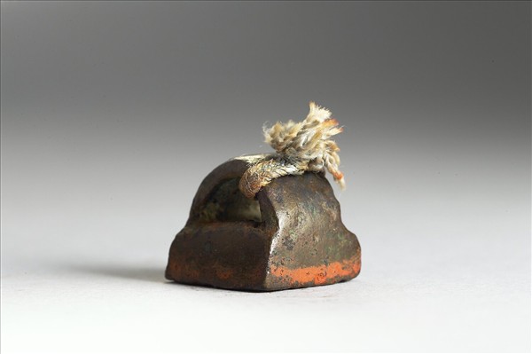 橋鈕,方面印體中厚,銅中帶紅,鈕上有繫繩,印文「靳叔貝」三字白文無邊,整體篆法雄渾古樸,本印置於清乾隆朝「金薤留珍」黑地金漆龍紋屜匣之五篋其中「府」屜之中。
