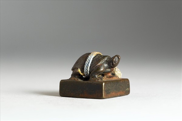 龜鈕,方面印體,印文「□雲私印」四字作白文無邊。此印龜鈕雕刻精細,背挺首昂,鈕上有繫繩。本印置於清乾隆朝「金薤留珍」黑地金漆龍紋屜匣之五篋其中「府」屜之中,屜並附有小冊頁,小冊頁作梵夾式,七開,木質封面有「金薤留珍 府」填綠隸款。內頁除清高宗行書題銘「金薤留珍」四字外,還書有為該屜匣所收銅章品目項類,以及銅章鈐跡、印文釋文等。
