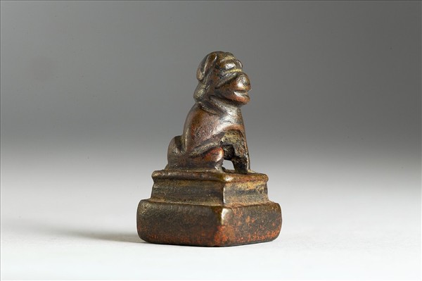 獸鈕,方面印體作二層高聳,銅中帶紅,印文「清□□」三字作陰文方框。本印置於清乾隆朝「金薤留珍」黑地金漆龍紋屜匣之五篋其中「府」屜之中,屜並附有小冊頁,小冊頁作梵夾式,七開,木質封面有「金薤留珍 府」填綠隸款。內頁除清高宗行書題銘「金薤留珍」四字外,還書有為該屜匣所收銅章品目項類,以及銅章鈐跡、印文釋文等。