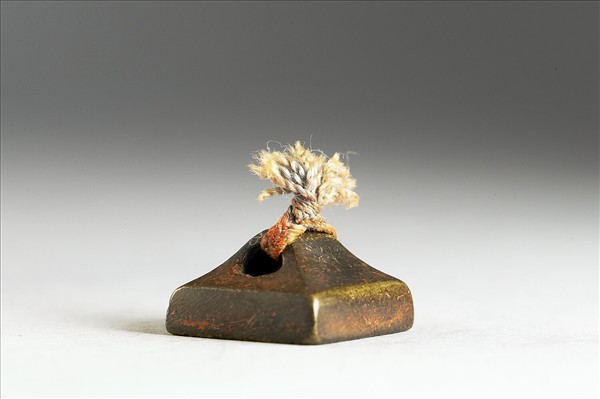 方形銅印,印背穹起而帶對穿孔,繫繩,印面帶有邊欄,鑄朱文「□□□」三字,文字無法辨識。本印置於清乾隆朝「金薤留珍」之五篋其中「府」屜之中。「金薤留珍」乃乾隆朝時將內府所收的前代印記整理編次而成;包含銅官印221件,私印1070件,共1291件,存放於「東」、「壁」、「圖」、「書」、「府」五個黑地金漆龍紋屜匣中,並依各櫃所藏編製印譜。印譜目錄編次方式以官印為始,繼以私印,可能是承襲明顧從德《集古印譜》之編目方法。