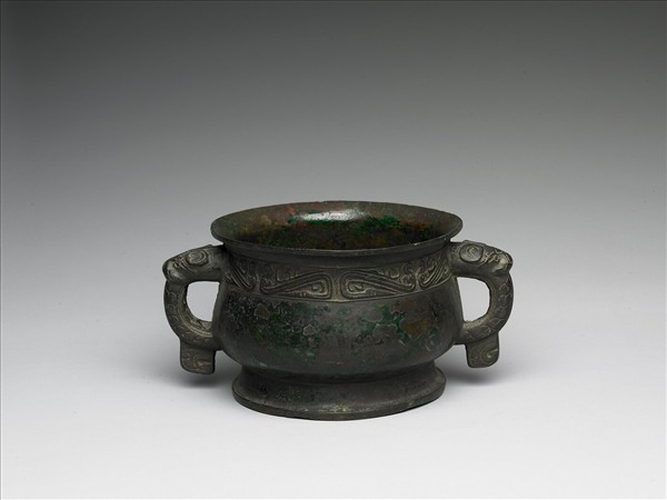 侈口,卷沿,束頸,垂腹,腹側為環狀雙耳,耳上部為浮雕獸首,下部為方形垂珥,圈足外撇,近底處起淺臺。口沿下為S形回首夔紋,圈足內底有菱格紋。本器與陝西灃西張家坡出土銅簋(M390:2)相近似。銘文在器內底。北京故宮博物院另藏有同銘青銅鼎(《集成》01954)。