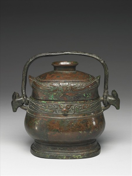 蓋器各飾鳳紋一道及弦紋一道,足飾弦紋二道,提梁飾蟬紋,兩端作羊首形,提梁脫焊。