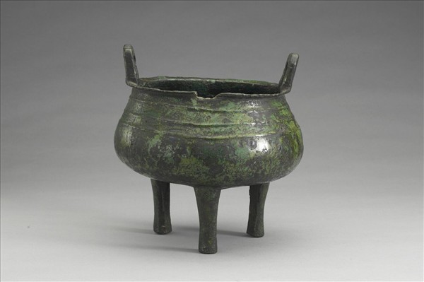 圓鼎,侈口,立耳,縮頸,鼓腹,柱足,口沿殘。腹飾弦紋。