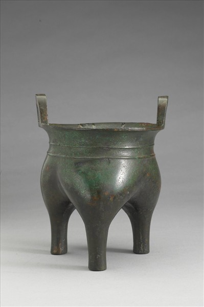 侈口,立耳,分襠,柱足。頸飾弦紋。