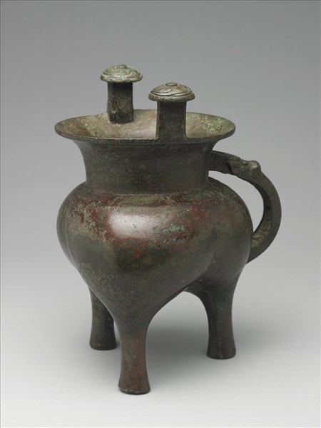 高頸,分襠形腹,實足,二立柱斝。頸與腹各飾二弦紋,其形制與紋飾近於殷墟晚期後段的河南安陽戚家莊東M63斝,唯後者是空足,分襠腹較不外鼓,此斝可能較晚。其側出一鋬,鋬上飾有牛首,內側仍殘留心土,鋬與器身相接處微見溢銅。