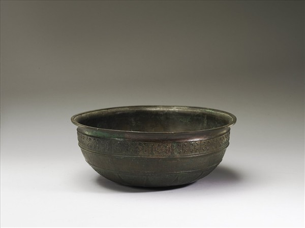 折邊,弧形壁,平底。口沿下飾蟠虺紋二道。底飾尖角紋,間以蟠虺紋。器內有十字雲紋。