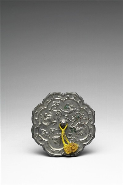 八瓣菱花形鏡,半球鈕。鏡背浮雕紋飾以鏡鈕為中心,成熟與幼小的鳳鳥展翅繞行。鳳鳥間飾以卷草紋,展現華麗輕快流暢的盛唐風格。鏡緣略高,飾一周花葉紋。