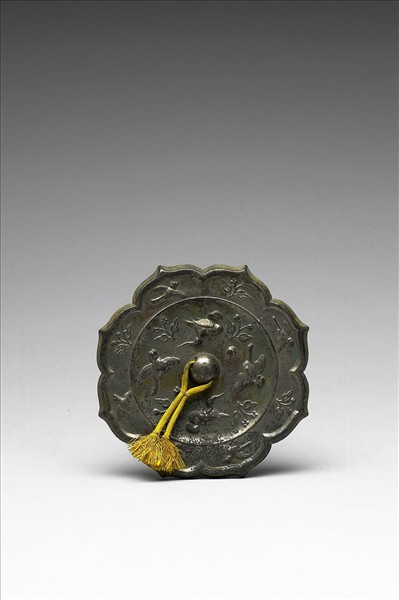 八瓣菱花形鏡,半球鈕。鏡背有鳥四隻,或做展翅,或靜止,間飾花枝,鏡緣則以花枝與小鳥間隔排列。