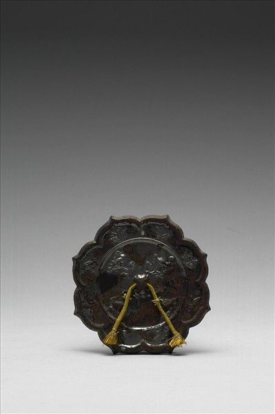 圓鏡,作八瓣菱花形、獸形鈕。鏡背飾鳥四隻,站立於葉枝之上,鏡緣則以花枝與蝴蝶間隔排列。