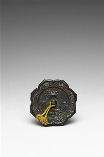 八瓣菱花形鏡,半球鈕。鏡背飾仙人乘獸與仙山兩組,鏡緣則有花枝、蝴蝶與卷草間隔排列。