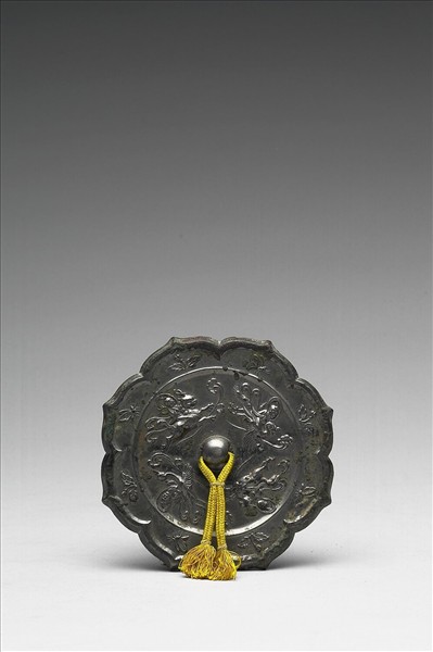 八瓣菱花形鏡,半球鈕。鏡背飾仙人乘獸,間有卷雲,鏡緣則有花枝與蝴蝶間隔排列。