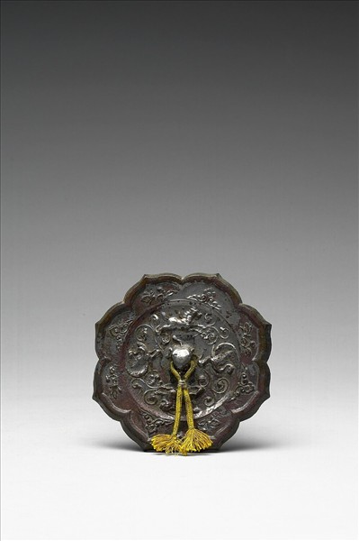 圓鏡,作八瓣菱花形、獸形鈕。鏡背有兩飛鳥與獸,間飾卷雲,鏡緣上則有蝴蝶花枝與卷草間隔排列。