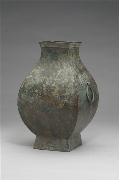 鈁,全器作方形,侈口,縮頸,鋪首銜環耳,鼓腹,高圈足。頸部銘文可辨者四字:「四斗五升」。