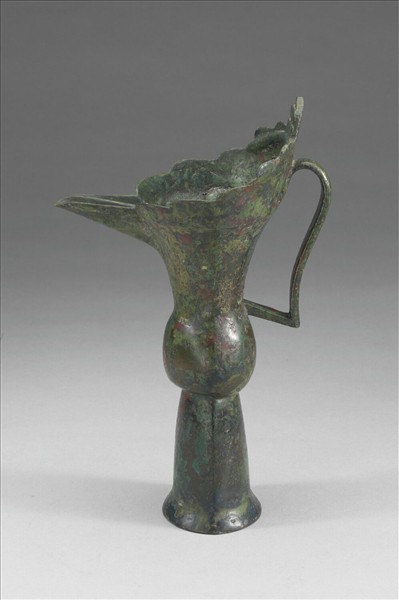 口沿向上層層高突,形似僧伽帽,尖流,附把,鼓腹,高圈足。