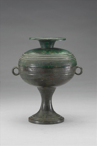 圓豆,蓋與腹呈圓球體,蓋附圓捉手、子母口、環耳,柄作高圈足。蓋飾瓦紋、幾何紋,腹飾弦紋、三角幾何紋、綯紋,足飾綯紋、蟠螭紋、瓦紋,捉手飾幾何紋、圓渦紋。