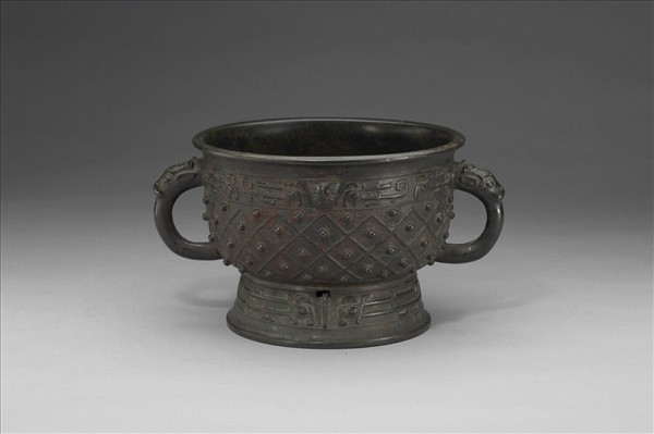 侈口,折沿,直壁深腹,獸首半環耳,圈足外撇,近底 處起淺臺。口沿及圈足飾夔龍紋,器腹飾斜方格乳丁紋。圈足上的分笵處有方形穿孔。形制、紋飾與陝西長安斗門鎮普渡村出土西周早期銅簋(M2:23)相似。銘文在器內底。帶有「□」族氏銘文的銅器多屬商末周初,曾大量出土於山西靈石旌介商墓。