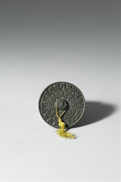 圓形鏡,圓形平鈕。鏡背為梵文蘭察體咒語,在鏡鈕及鏡背上,分三層同心圓佈列。鏡鈕上為梵文「唵」(om)字。鏡背外圈咒文20 字,內圈16 字,由外向內誦讀,包括准提咒、淨法界真言、文殊一字咒及六字大明咒。準提咒源自印度,以鏡為壇觀想誦咒,是修行準提法的一種方式。