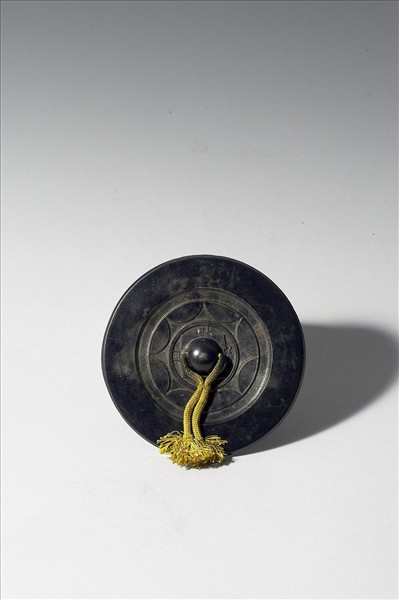 圓形鏡,半球鈕,方花紋座,柿葉瓣間夾有「宜官位矦」銘文。外環以內向八曲連弧紋。鏡緣寬厚平素。