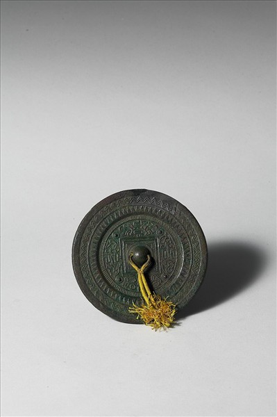 圓鏡,半球鈕、圓鈕座。鏡背飾大方格與博局紋,夾有細線獸紋與乳丁紋。鏡緣有雙層三角形紋。