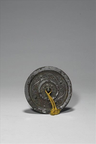 圓形鏡,半球鈕,四瓣連珠紋鈕座。主紋以四個圓座半球乳丁為界,間以細線勾勒的S形虺龍紋。龍身兩側各填一小鳥紋。外緣寬厚平素。