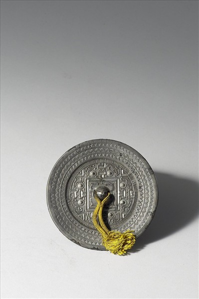 圓鏡,半球鈕、變形四瓣葉形鈕座。鏡背飾鏡背飾大方格與規矩紋,其中夾有乳丁與四瑞獸,鏡緣有三層三角形紋。