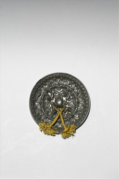 圓鏡,獸形鈕。鈕外飾四隻瑞獸,鏡背中央有凸棱,外圈飾鳥紋,展翅與靜止間隔排列,葡萄與藤蔓夾雜其中。鏡緣為連珠花紋。
