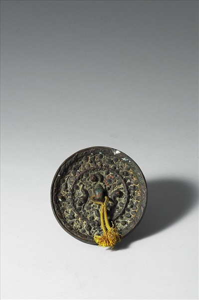 圓鏡,獸形鈕。鈕外飾四隻瑞獸,鏡背中央有凸棱,外圈飾鳥紋,展翅與靜止間隔排列,葡萄與藤蔓夾雜其中。鏡緣為卷草紋。
