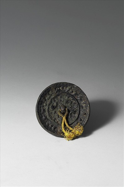 圓鏡,獸形鈕。鈕外飾四隻瑞獸,鏡背中央有凸棱,外圈飾鳥紋,展翅與靜止間隔排列,葡萄與藤蔓夾雜其中。鏡緣為連珠花紋。