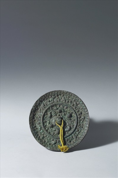 圓鏡,獸形鈕。鈕外飾四隻瑞獸與鳥紋,鏡背中央有凸棱,外圈飾鳥紋,展翅與靜止間隔排列,葡萄與藤蔓夾雜其中,外圈另間飾有蜜蜂與蜻蜓。鏡緣飾連珠花紋。