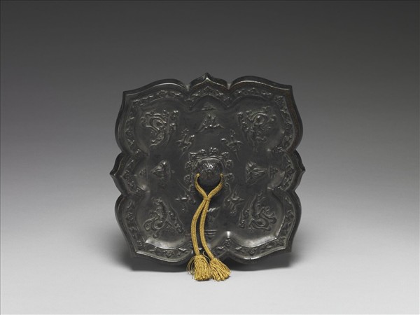 鏡作方菱花形,圓鈕飾番蓮花瓣紋,變形四葉雲頭紋鈕座,若將鈕穿橫平置之,劃一水平線則上、下紋飾恰成對稱之態。座外隅角四禽鳥口銜花枝翔於雲氣之上,四方各飾一崇山峻嶺,與中心突起的鏡鈕合為五岳。禽鳥之上四飛仙巾帶飄揚雙手各持一祥花瑞草飛升於雲氣之上,四方山岳上更飾三道橫界線似有雲山隱於其間。鏡邊寬素,近緣飾禽鳥雲氣紋一周。由西安唐玄宗天寶四年(745)韓森寨一號墓所出飛仙鏡得知,此類紋飾流行於盛唐。該鏡下方山岳代表人間淨土,上方雲山象徵佛國清境,雲山下三道橫線或許象徵佛教三界之義,佛教認為三界(梵文Trilokya)是「迷界」,是有情眾生存在的三種境界,即﹕欲界、色界、無色界,皆處在「生死輪迴」中,唯有從三界解脫達到「涅盤」才能成「佛」。或許這正是所有飛仙鏡特別強調三橫線的奧義所在。