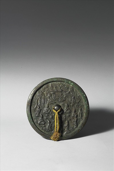 圓形鏡,半球鈕。鏡緣寬素。鏡背浮雕紋飾為一幅仙人宴享圖。上方為仙山樓閣及雲朵,右方有一仙人乘鳳降臨。仙人或立或坐,齊聚柳畔宴飲嬉遊。 仙人服飾帶有晚唐五代風情,鏡體及紋飾布局則具有金代特徵,為金代山水人物故事鏡中的佳構。