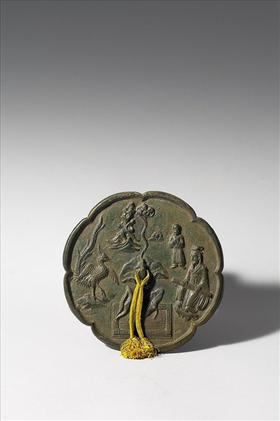 八瓣葵花形鏡,龜形鈕。鈕下方為一方池,池中蓮葉托住口吐仙氣的龜鈕。千年龜遊於蓮葉上,有慶壽之意。池畔右側為鼓琴文士及童子,左側為聞樂展翅起舞的鳳凰。鏡鈕上方有點景之太湖石及瑞花,與蓮池一同表現庭園造景。鏡緣素窄高起。 帶有此類紋飾的銅鏡流行於唐代中晚期,部分帶有銘文,其中又以「真子飛霜」最為常見,北京故宮博物院所藏一例有方框「侯瑾之」銘文三字。學界對「真子飛霜」有許多解釋,或認為是伯牙彈琴,或認為真子是楊貴妃。本鏡紋飾內容雖與「真子飛霜」鏡相同,但從人物及蓮池的刻畫細節,及銅鏡色澤、鏡緣型態等觀察,均具宋代銅鏡特徵,應為北宋工匠延續唐鏡題材及鏡式所製。