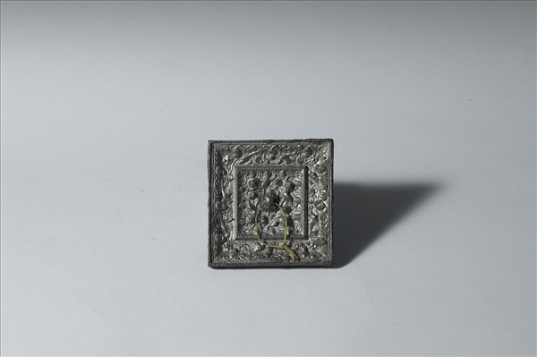 銅鏡為方形鏡,伏獸鈕。鏡背以連珠紋脊分為內外兩區。紋飾以浮雕葡萄藤蔓紋襯地,內區為高浮雕獅子四隻,面向四角。外區為飛鳥及蝴蝶。鏡緣高聳,內側飾連珠紋一周。 清宮為此鏡配一方形木匣,並附「入右上等唐鏡一面」黃籤一張。匣內有一活動支架,立起即可作為鏡架,供照容使用。