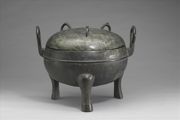 附蓋圓鼎,蓋與腹呈圓球體,子母口、環耳、深腹、蹄足,蓋有三半環紐。腹飾凸弦紋。